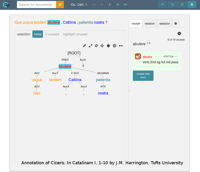 Arethusa is an evolution of Alpheios treebank editor, developed with support from the Andrew W. Mellon Foundation, the Institute of Museum and Library Services and the European Social Fund. Arethusa supports customizable annotation formats, automatic morphological parsing, user data, and a variety of other features.